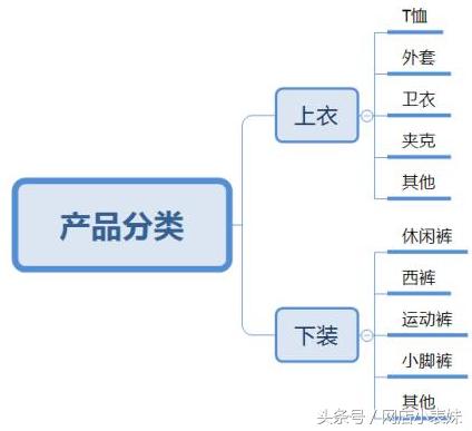 經(jīng)常看到一些店鋪里既有上衣也有褲子,是這么分類的,首先是分“上衣”與“下裝”,然后在“上衣”和“下裝”下面再新建子分類,大概的樣子是如圖所示: